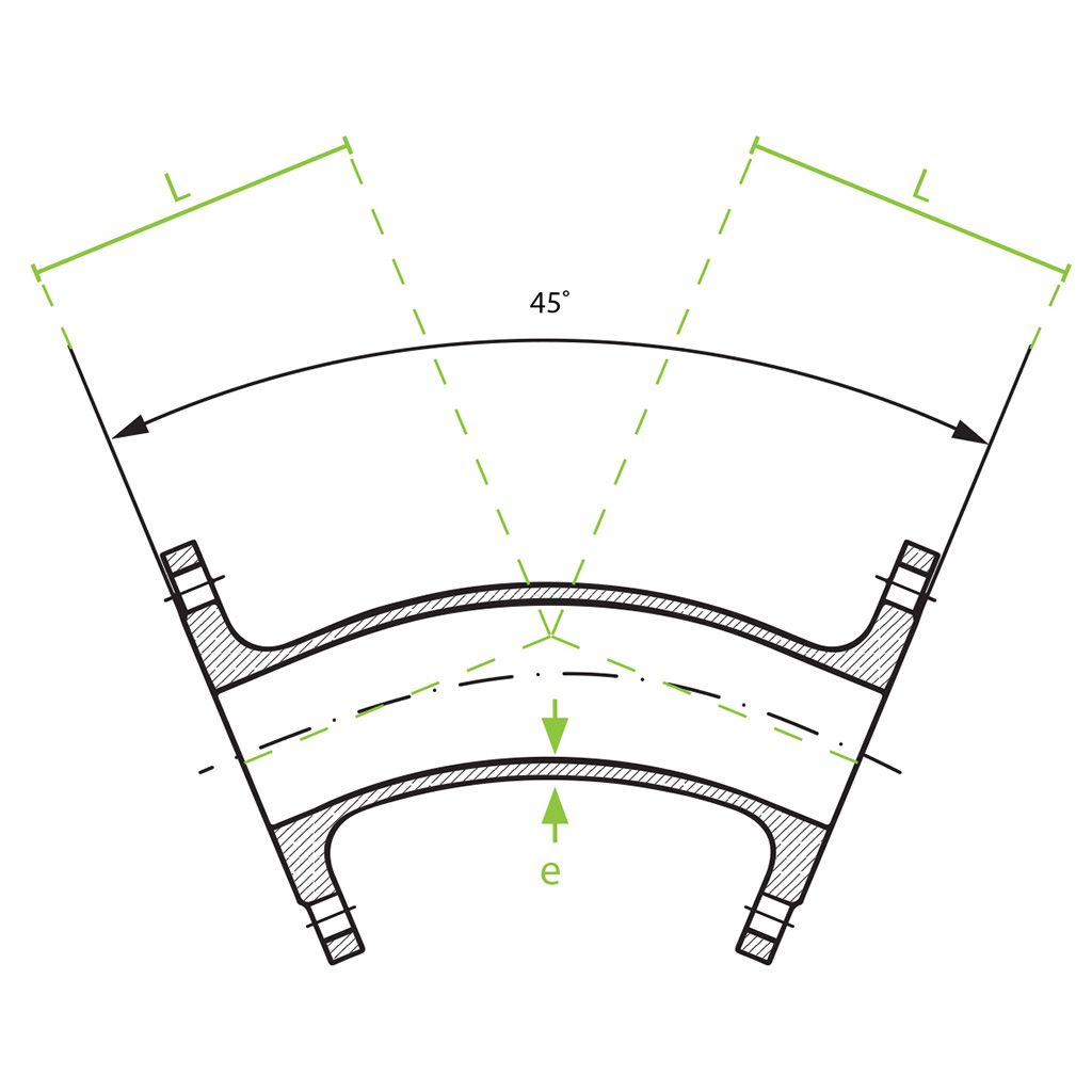 جهت اتصال دو لوله با انتهای فلنجدار که نسبت به یکدیگر زاویه 45° دارند، استفاده میشود. استاندارد فلنج بر اساس DIN EN 1092 – 2. استاندارد ابعاد بر اساس ISO 2531. استاندارد ریختهگری بر اساس DIN EN 1693.